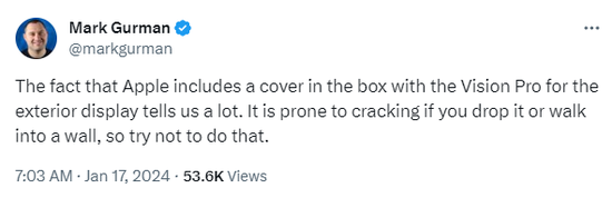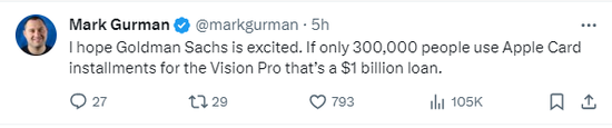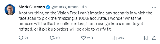 此外,Gurman还发推文“吐槽”Vision Pro: