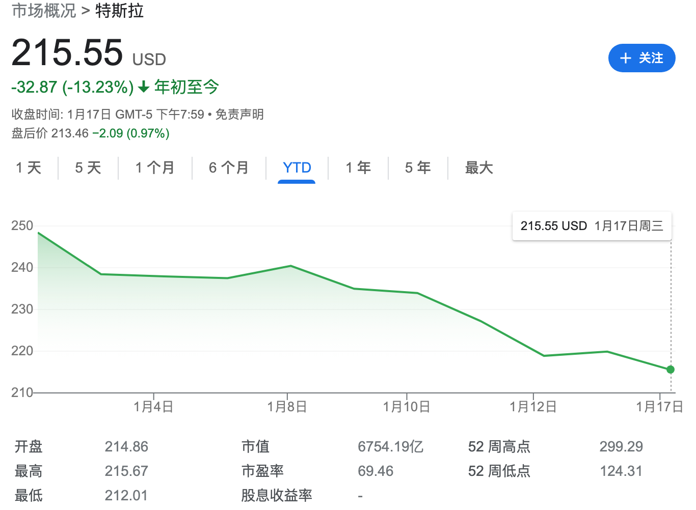 这些降价,加上瑞银集团和富国银行分别下调其目标价,拖累特斯拉股价周三下跌约2%。这令该股在2024年的糟糕开局进一步恶化。自年初以来,特斯拉股价已经下跌逾13%。
