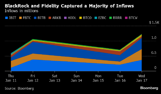 总计约有8.8亿美元流入富达的比特币ETF。贝莱德和富达推动了这种新资产的早期整合,这两家公司获得了市场上九支新ETF资金流入的68%,总额近20亿美元。