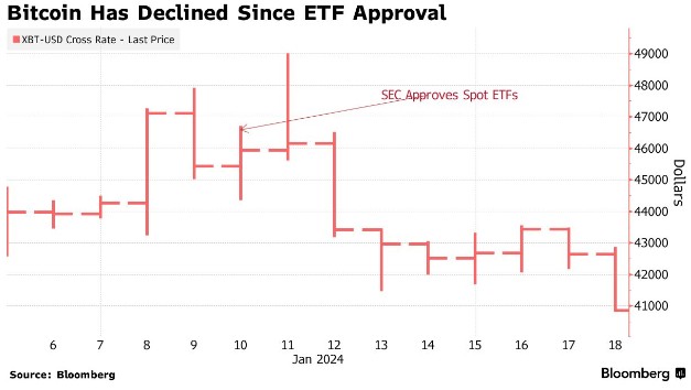 最大的加密货币比特币下跌了4.3%,至40809美元,在1月10日美国证券交易委员会签署后下跌了约11%。比特币去年上涨了近160%,市场乐观地认为这些基金将扩大需求。