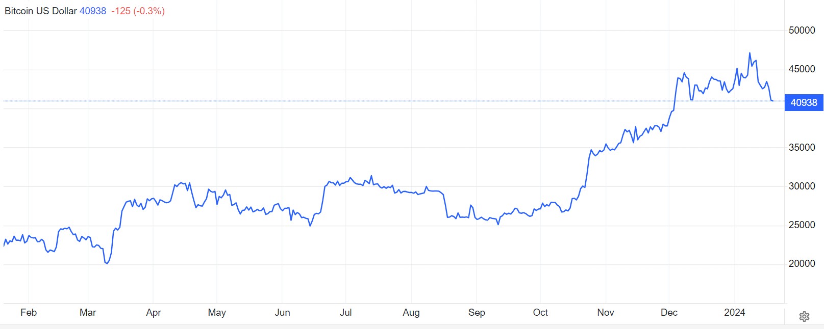 然而自1月11日以来,比特币价格在“买预期卖事实”的这种获利了结情绪之中已经下跌超8%。由于市场自2023年年末以来一直预期ETF最终会得到SEC的正式批准,比特币近几个月在这种呼声中持续暴涨,从10月份的不到3万美元涨至如今的4.1万美元。