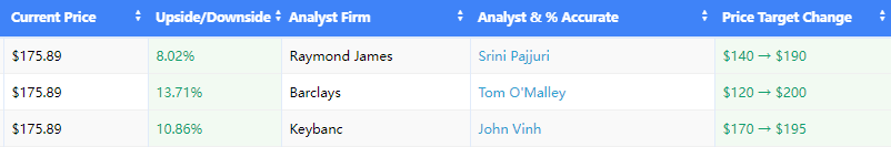 Wagner补充称,在见识到英伟达过去一年的出色表现后,投资者正在找寻“追赶式”交易的标的。与此同时,Keybanc、Raymond James、巴克莱先后将AMD的目标价调整至190-200美元之间,这一区间意味着分析师们认为该股还有8%-14%的上涨空间。