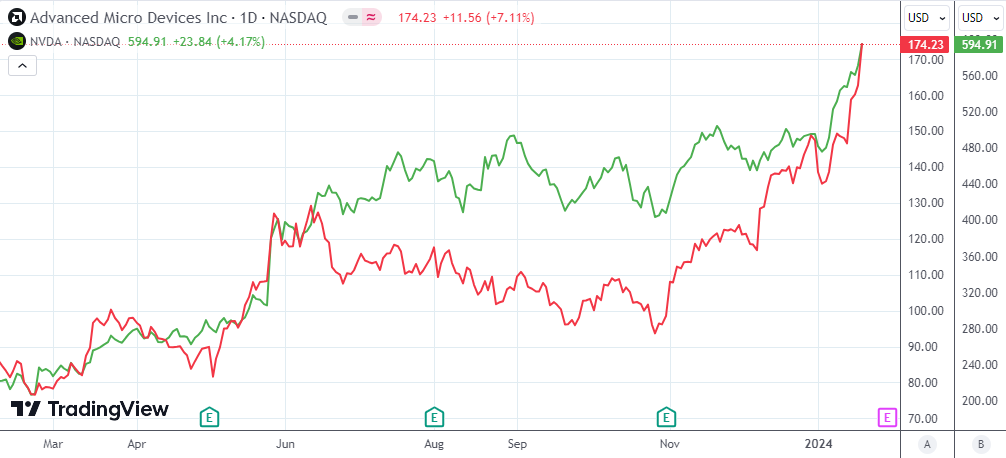 随着市场重新建立起对半导体行业增长前景的乐观情绪,两大GPU巨头的股价均收创历史新高,其中AMD(超威半导体)的表现甚至要比“AI宠儿”英伟达更加亮眼。具体行情显示,英伟达周五收涨4.17%报每股594.91美元,继周四再次刷新了历史最高收盘价。英伟达本周累涨8.74%,目前市值接近1.5万亿美元,在美股上市公司中排名第五,落后于微软、苹果、谷歌和亚马逊。