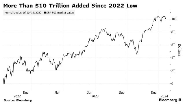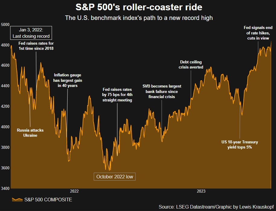 从2022年1月3日创下的前历史最高收盘价4796.56点,到2022年10月的最低点,标普500指数在此期间曾下跌过25%。但如今,这些昔日的痛苦回忆已被彻底抹去。本周五,标普500指数跳涨1.23%,以4839.81点的收盘纪录新高报收;在盘中,这一基准指数还创下了4842.07点的历史最高位。