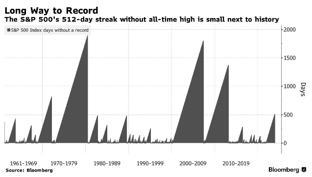 当然,从历史上看,512个交易日未能创新高,还并不算特别漫长——这仅是自1928年以来的第六长纪录。上世纪70年代,由于通胀飙升和经济增长停滞,标普500指数曾有过一段七年多时间没有创下新高的经历。