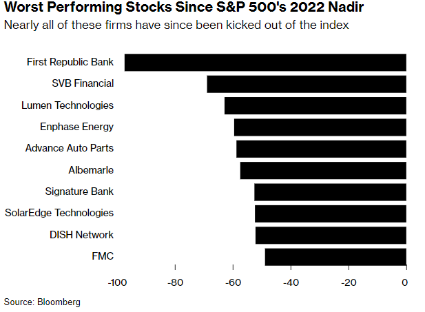 在此期间,其他主要下跌的公司包括了Lumen Technologies、Advance Auto Parts和Enphase Energy——这三家公司均暴跌约60%。不过,这些表现最差的公司如今大多已不在标普500指数成分股名单中。