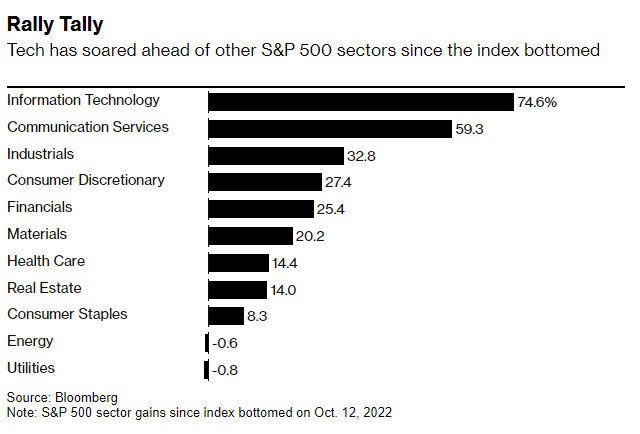 统计显示,自标普500指数在2022年10月触底以来,信息技术、通信服务和非必需消费品等行业引领了标普500指数的反弹。这些行业也是美股七巨头的聚集地。