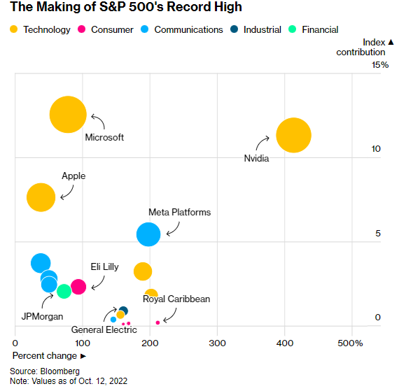 自2022年10月以来,标普500指数涨幅最大的公司是英伟达,其股价在去年5月发布乐观销售预测后一路暴涨,并一举点燃了人工智能热潮,累计涨幅超过400%。紧随其后的是皇家加勒比游轮公司、Meta和博通公司。