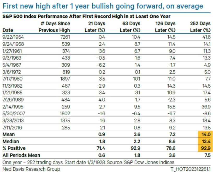 根据Ned Davis Research首席美国策略师Ed Clissold的统计,以史为鉴,在标普500指数时隔逾一年时间创下新高的14次经历中,该指数有13次在未来一年能进一步上涨,涨幅中位数高达13%。
