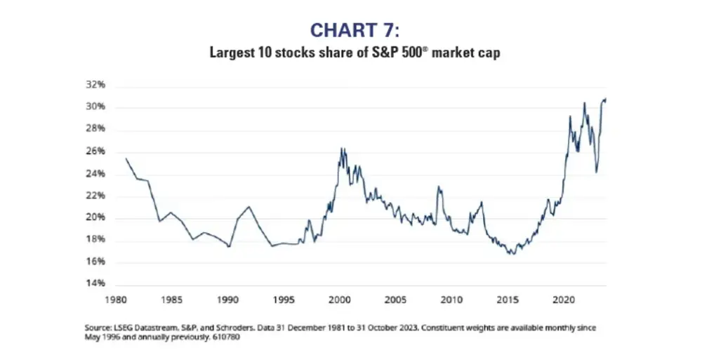 Suzuki表示,与此同时,估值和投资者对大型科技公司的集中程度看起来非常极端,甚至比之前的股市泡沫时期还要严重。标准普尔500指数中排名前10位的股票目前占该指数总市值的30%以上,这是40多年来的最大份额。