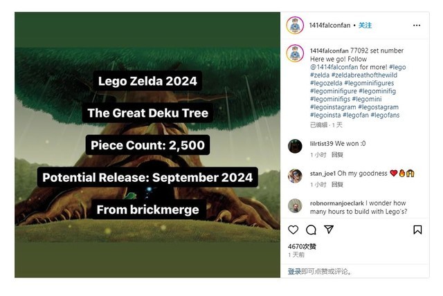 根据知名乐高爆料者1414falconfan的最新消息,《塞尔达传说》系列将推出首款乐高积木套装。该套装配套编号为77092,总零件数达到2500件,预计将于2024年9月上市。据悉,这款积木套装将以克洛格森林中的大精灵“德库树”为主题。如果这些传闻属实,这将是《塞尔达传说》与乐高品牌之间的首次合作,同时也是两款热门IP之间的一次重要跨界合作。