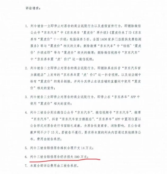 途虎养车方面提出诉讼请求,要求京东养车停止商业诋毁行为以及虚假宣传行为,删除在微信公众号、微博、抖音、京东养车App的相关内容,并且赔偿途虎养车经济损失500万元。