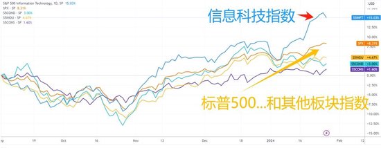 在刚刚过去的两周里,标普500指数时隔两年再度创出历史新高,而这一轮涨幅的成色,也将在下周(1月29日-2月2日)期间遭遇高强度的考验。作为这篇文章的背景,虽然标普500指数创新高不假,但实际上在细分的11个板块指数中,只有包含苹果、微软、英伟达等明星股票的信息科技指数同样创出新高,另外10个板块指数平均距离新高还有15%的距离。
