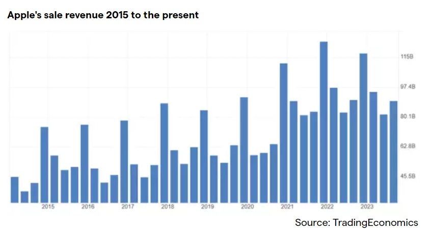 基于iPhone的优异表现,有分析师预测苹果营收将创下历史新高。根据摩根士丹利分析师的预期,苹果第一财季的营收将达到约1190亿美元,这是由于新iPhone系列的大量上市,尤其是iPhone 15系列,预计这将为苹果带来可观的营收。