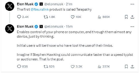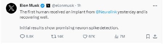 当地时间周一晚间,马斯克在X平台上发帖称,第一位人类患者已经接受其初创公司Neuralink Corp.的大脑植入芯片,患者“恢复良好”且初步结果令人鼓舞。马斯克随后发帖称:“Neuralink的首个产品名为Telepathy(心灵感应)。