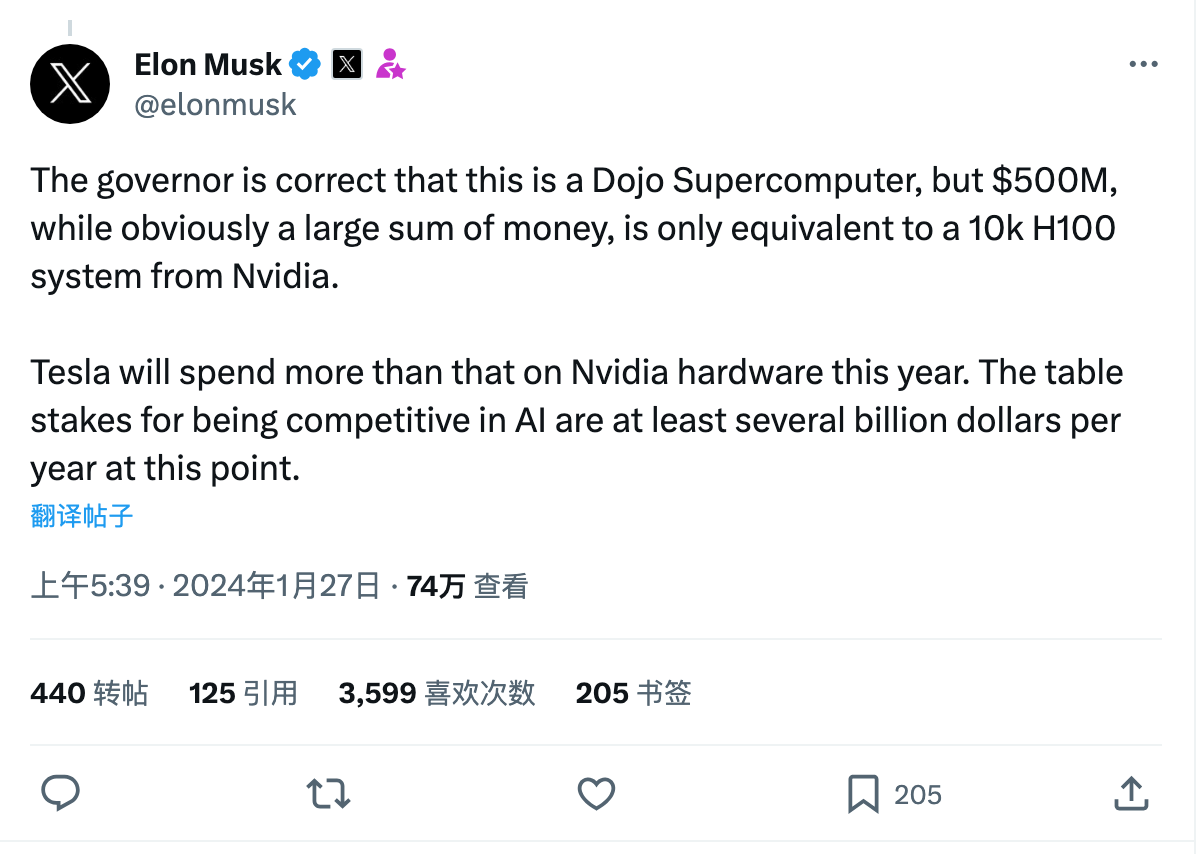 “虽然5亿美元显然是一大笔钱,但只相当于大约10000颗英伟达H100芯片。”马斯克在X上的一篇帖子中表示。“特斯拉今年在英伟达硬件上的支出将超过这一数字。要想在AI领域具有竞争力,每年至少要投入数十亿美元。”