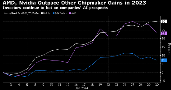 这一业绩展望再次引发了对客户推迟购买AMD产品的担忧,AMD核心市场包括个人电脑、服务器、游戏机和可编程处理器。尽管该公司正在进军人工智能加速器芯片,但仍处于扩张初期。这是一个利润丰厚的领域,英伟达占据着主导地位。