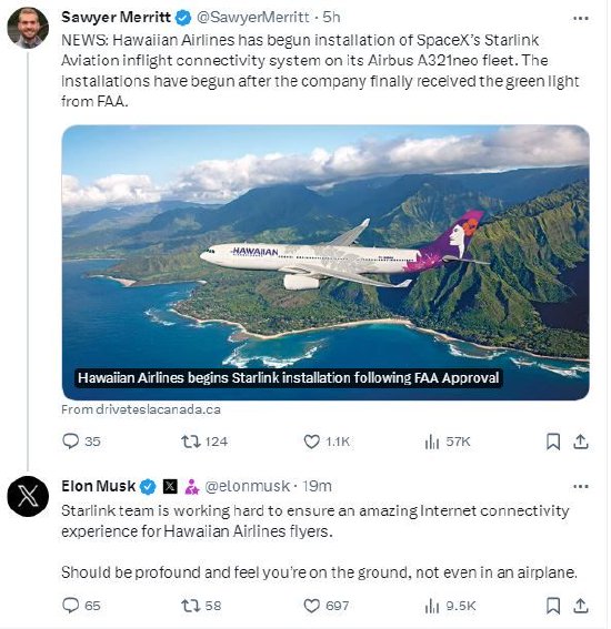 电动汽车分析师索耶·梅里特在X平台上分享了这一消息,马斯克回应称:“星链团队正在努力工作,以确保夏威夷航空公司的乘客获得惊人的互联网连接体验。(体验)应该是深刻的,感觉你是在地面上,而不是在飞机上。”