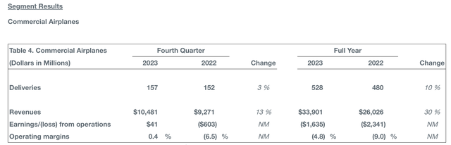 具体来看,波音商用飞机业务去年第四季度收入增至104.81亿美元,同比增长13%,占比总收入的47.6%。营运收益为0.41亿美元,实现扭亏,2022年同期为-6.03亿美元,营业利润率为0.4%,去年同期为-6.5%。全年来看,波音商用飞机业务收入增至339.01亿美元,同比增长30%,占比总收入的43.58%。营业利润率为-4.8%,去年同期为-9%。