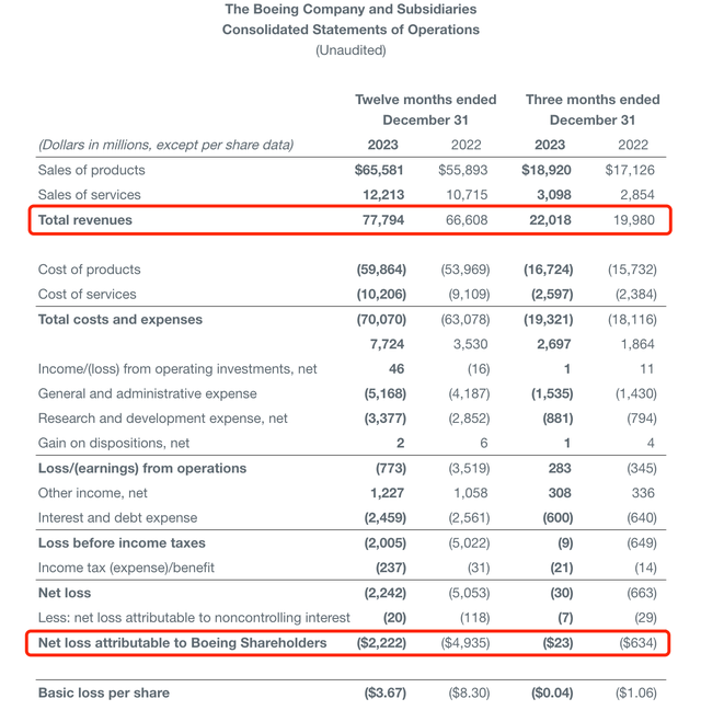去年业绩因销量增加而有所改善,波音2023年全年实现营收777.94亿美元,同比增长16.79%。归母净亏损22.22亿美元,同比收窄54.97%。