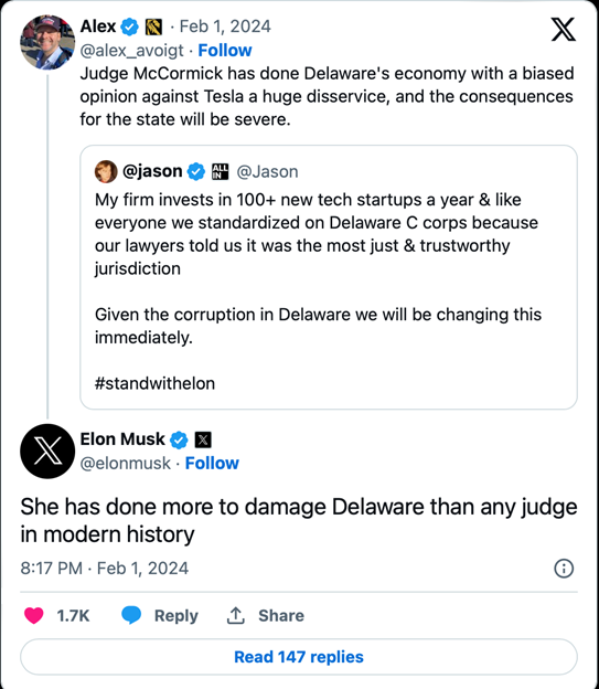 显然,马斯克对这一判决非常恼火,连续在自己的X平台(原先的推特)连续隔空吐槽女法官。马斯克公开发起调查,询问自己是否应该将特斯拉注册地从特拉华州转移到实际总部所在地的得克萨斯州,又嘲讽麦克考米克称,“她对特斯拉带来的损害,超过了现代历史上的任何法官”。