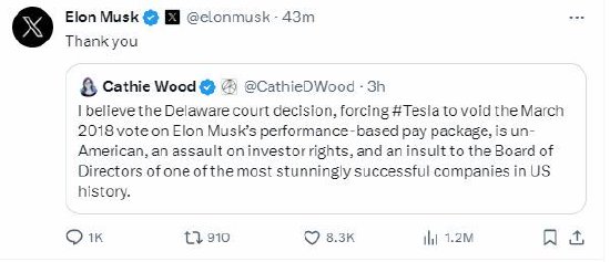 伍德在接下来的帖子中写道:“他们(特斯拉投资者)买了自己的第一套房子,供孩子上了大学,并在特斯拉的帮助下增加了退休储蓄。特斯拉的故事是人们涌向美国的缩影。特拉华州法院的裁决是对我们国家理想的一种尴尬和嘲弄。”
