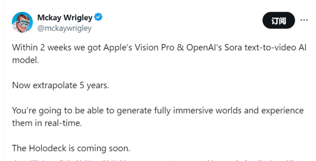 Takeoff AI是专注于AI Tools的创业公司,它的创始人认为这一波OpenAI新技术的最大受益者可能是虚拟现实。“在两周内,我们连续有了苹果(183.86, -0.29, -0.16%)的Vision Pro和OpenAI的Sora文本到视频AI模型。五年之后,你将能够生成完全沉浸式的世界,并实时体验它们。Holodeck(应该是指今年火爆的掌机Steamdeck的虚拟现实版本)很快就要来了。”
