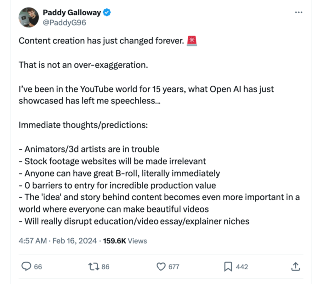 YouTube大V Paddy Galloway感慨:“内容创作永远改变了。这不是夸张。我在YouTube世界已经15年了,OpenAI刚刚展示的东西让我说不出话来…”他认为,Sora将带来以下这些改变: