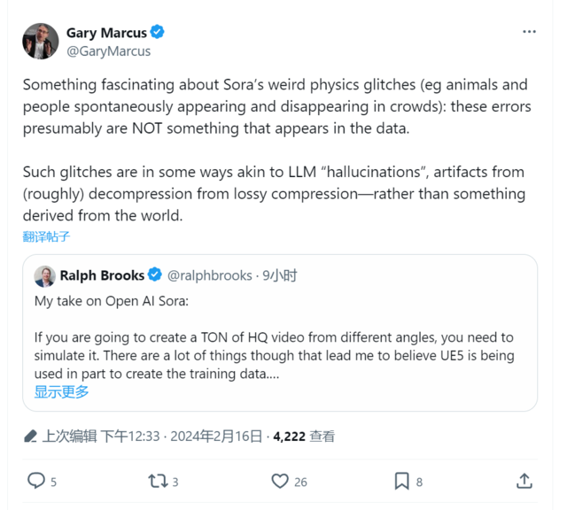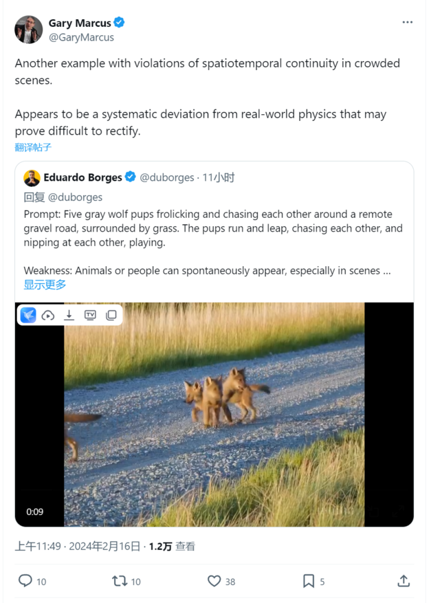 除了这些技术上的猜测和对产业影响的正面预测外,也有老反对派指出Sora的潜在问题不那么容易纠正。