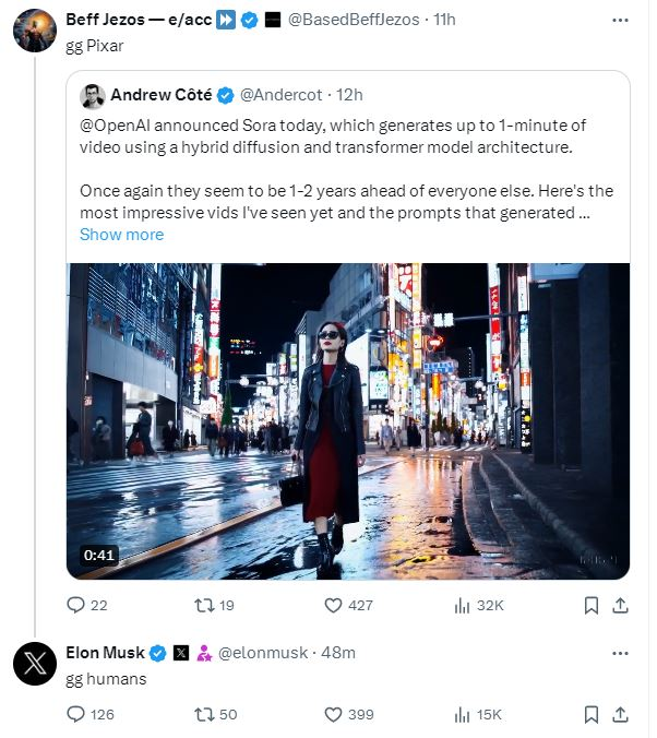 马斯克评OpenAI视频模型:人类认赌服输,但AI增强的人类将创造出最好作品