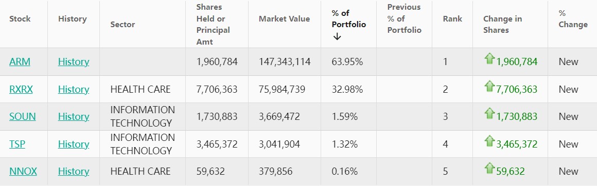 截至2023年第四季度的最新13F披露报告显示,英伟达还披露了对芯片设计领域领导者Arm(ARM.US)、自动驾驶卡车制造商图森未来(TSPH.US)、专注于AI制药领域的生物技术公司Recursion Pharmaceuticals(RXRX.US)以及医疗成像技术开发商Nano-X Imaging (NNOX.US)的投资。