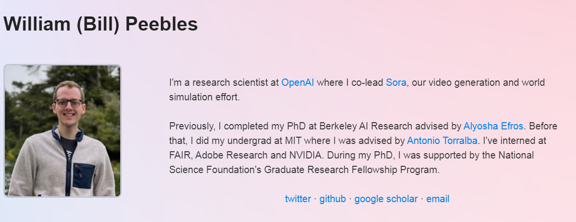 从年龄上来看,这支团队也非常年轻,两位研究负责人都是在2023年才刚刚博士毕业。William (Bill) Peebles于去年5月毕业,其与Saining Xie合著的扩散Transformer论文成为Sora的核心理论基础。Tim Brooks于去年1月毕业,是DALL-E 3的作者之一,曾在Google和英伟达就职。