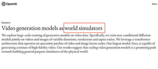 OpenAI 官网上,关于 Sora 的这篇研究论文名为《把视频生成模型作为世界模拟器》。请注意‘世界模拟器’(world simulators)这个关键词,它是比生成视频更关键的核心所在。