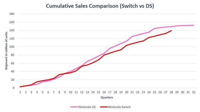 全球销量方面, Switch销量达到1.3936亿台,和DS游戏主机销量差距缩短至1400万台,即将成为全球发售量第二大游戏主机。