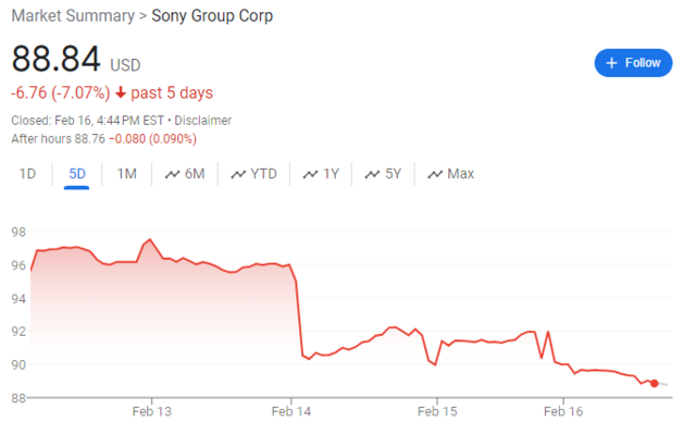 消息公布后索尼股价闪崩,相关数据显示,索尼在股票市场的总市值已蒸发了约100亿美元,美股股价已经累跌逾7%。