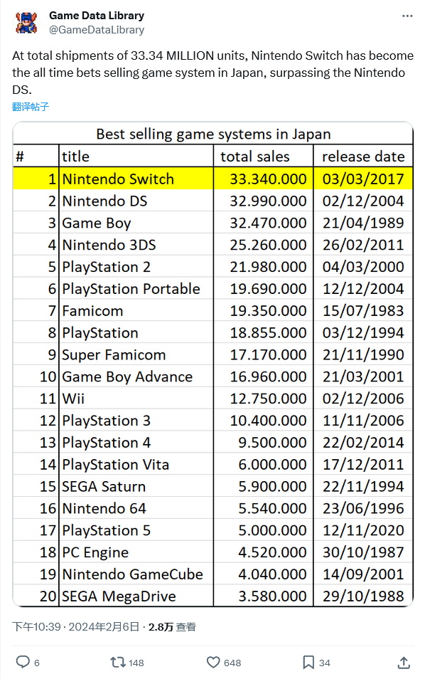 任天堂2月1日公布的财报数据显示,Switch日本地区销量现为3334万台,已经超越了GB(3247万)和NDS(3299万),已成为日本地区最畅销的游戏主机。