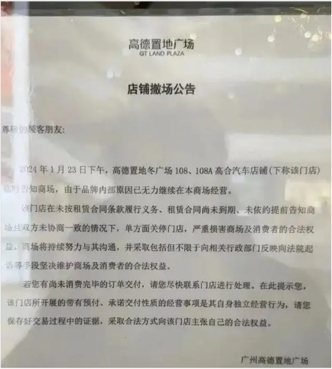 不过,随后高合汽车就被曝出了门店撤店的消息。1月底,高合汽车在广州一家汽车门店关闭,商场公告显示,“高合门店临时告知商场,由于品牌内部原因无力继续在本商场经营。”并称高合门店在未按租赁合同条款履行义务、租赁合同尚未到期、未依约提前告知商场且双方未协商一致的情况下,单方面关停门店。