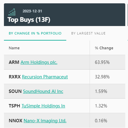 根据Whalewisdom统计显示,截至2023年12月31日,英伟达的持仓市值为2.3亿美元,标的只有5只股票。2月14日盘后表格公布后,这些股票均录得了明显的涨幅,表明英伟达在人工智能领域以及金融市场方面的影响力都在不断增强。