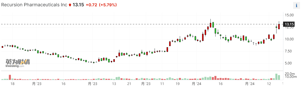 当时,黄仁勋在公告中表示,在开发新药和新的疗法方面,生成式AI是一种革命性的工具。上周四和上周五,在英伟达公布13F报告后的两个交易日,Recursion股价分别上涨了13.8和5.7%。