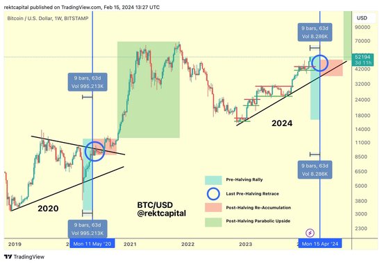 加密货币交易员兼分析师Rekt Capital在2月15日称,比特币在恢复上升趋势之前还剩下“最后一次减半前的回撤”。
