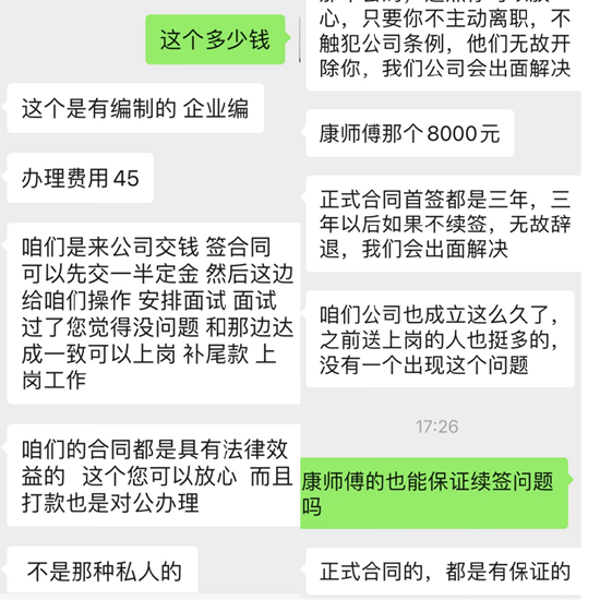 在该公司推荐的岗位中,几乎都是用人单位与求职者签订三年的正式合同,若三年后不续签或无故辞退,公司还会出面解决。“咱们公司也成立这么久了,之前送上岗的人也挺多的,没有一个出现这个问题。”