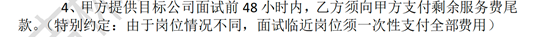 但仔细看,合同细则是经不起推敲的。例如,乙方必须在支付相应的服务费后,才能享受甲方提供的岗位信息服务,甲方提供目标公司面试前48小时内,乙方须向甲方支付剩余服务费尾款。
