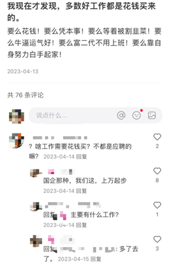 在小红书等社交平台上,有关花钱买工作靠不靠谱、花钱买工作渠道推荐等帖子并不少见,有人直言,在不少地方,各行各业的多数好工作都是花钱买来的,不花钱已经上不了班了。