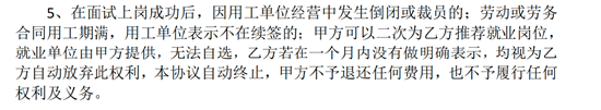 此外,合同还显示,在面试上岗成功后,如果用工单位经营中发生倒闭或裁员的;劳动或劳务合同用工期满,用工单位表示不再续签的;甲方可以二次为乙方推荐就业岗位,就业单位由甲方提供,无法自选,乙方若在一个月内没有做明确表示,均视为乙方自动放弃此权利,本协议自动终止,甲方不予退还任何费用,也不予履行任何权利及义务。