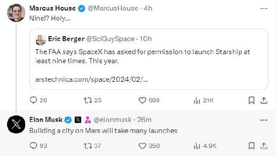 SpaceX首席执行官马斯克对有关该公司申请今年至少进行9次“星舰”飞船发射的消息进行了回应,默认该消息属实。此前有报道称,随着SpaceX即将于2024年从其位于德克萨斯州南部的星际基地(Starbase)发射第一艘“星舰”飞船(可能最快在三周内发射),该公司正敦促监管机构批准其加快发射节奏。