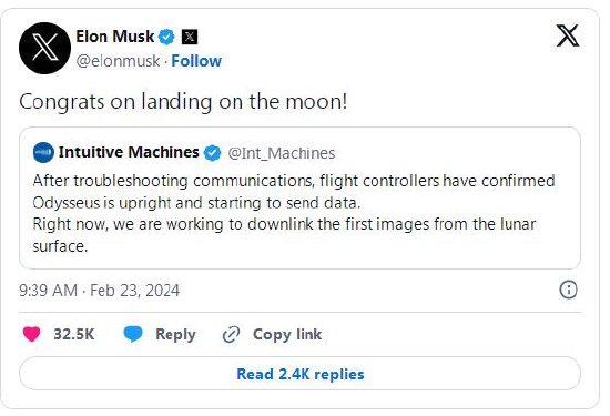特斯拉和SpaceX首席执行官马斯克也在他的社交媒体平台X上发帖,祝贺直觉机器公司成功登月。