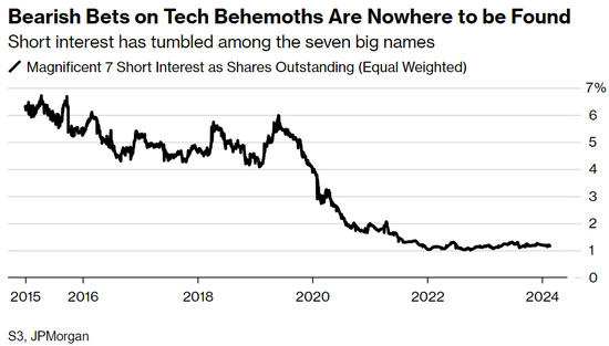 美股“科技股七巨头”的迅速上涨并没有伴随着看空押注的任何增加。据摩根大通策略师Nikolaos Panigirtzoglou估计,“科技股七巨头”的流通股的空头比例已跌至仅1%,徘徊在至少2015年以来的最低水平附近。据S3 Partners LLC的一份分析报告显示,英伟达股价上周四飙升16%之后,给那些仍在做空该股的对冲基金带来了约30亿美元的账面损失。最新的13报告显示,对冲基金的英伟达持股比例再次上升。散户交易员也在推动这一行动,他们对看涨期权的需求让人想起疫情时期的交易热潮。