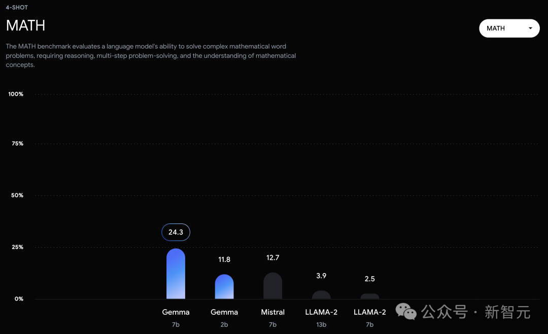不过,Gemma并没有能够在所有的榜单中,都拿下SOTA。在官方放出的评测中,Gemma 7B在MMLU、HellaSwag、SIQA、CQA、ARC-e、HumanEval、MBPP、GSM8K、MATH和AGIEval中,成功击败了Llama 2 7B和13B模型。