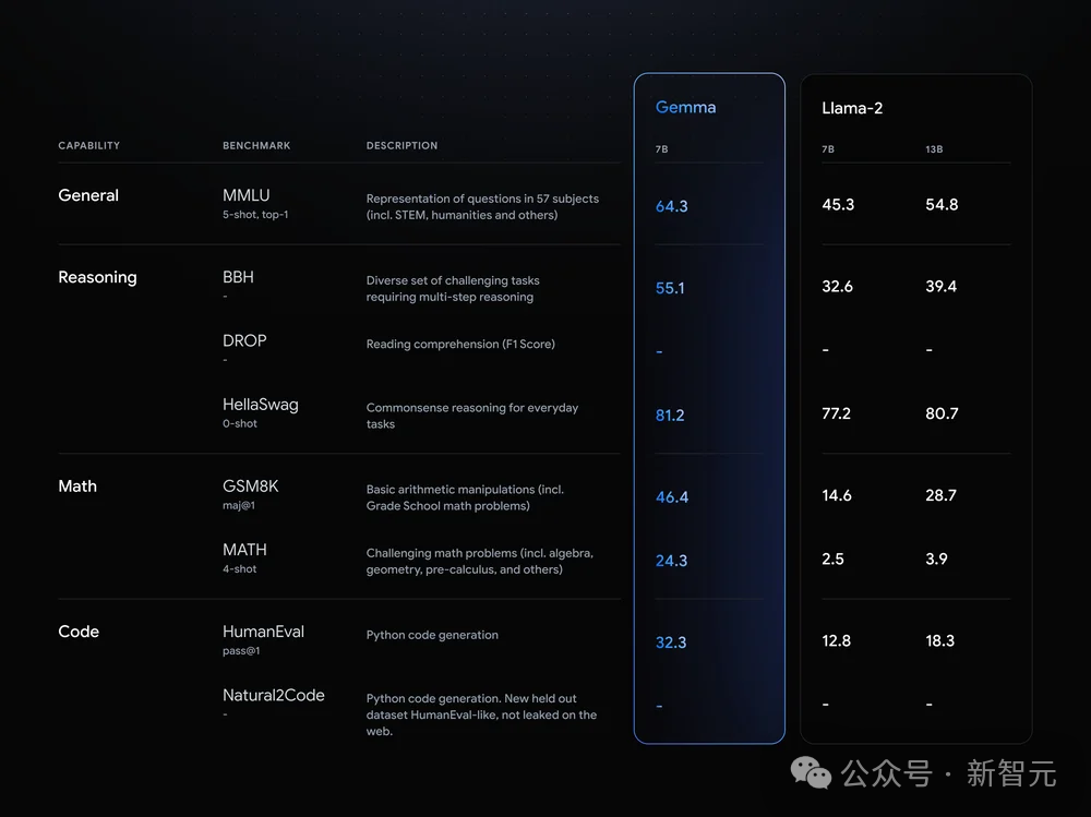 一声炸雷深夜炸响,谷歌居然也开源LLM了?!这次,重磅开源的Gemma有2B和7B两种规模,并且采用了与Gemini相同的研究和技术构建。有了Gemini同源技术的加持,Gemma不仅在相同的规模下实现SOTA的性能。而且更令人印象深刻的是,还能在关键基准上越级碾压更大的模型,比如Llama 2 13B。