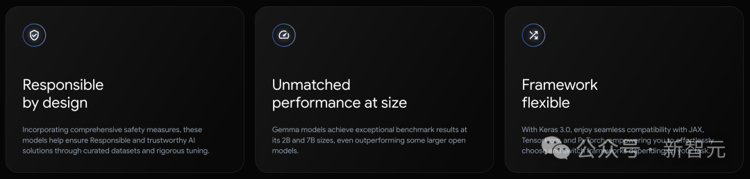 - 谷歌为JAX、PyTorch和TensorFlow提供了完整的工具链,支持模型推理和监督式微调(SFT),并且完全兼容最新的Keras 3.0。- 通过预置的Colab和Kaggle notebooks,以及与Hugging Face、MaxText、NVIDIA NeMo和TensorRT-LLM等流行工具的集成,用户可以轻松开始探索Gemma。- Gemma模型既可以在个人笔记本电脑和工作站上运行,也可以在Google Cloud上部署,支持在Vertex AI和Google Kubernetes Engine (GKE) 上的简易部署。- 谷歌还对Gemma进行了跨平台优化,确保了它在NVIDIA GPU和Google Cloud TPU等多种AI硬件上的卓越性能。并且,使用条款为所有组织提供了负责任的商业使用和分发权限,不受组织规模的限制。